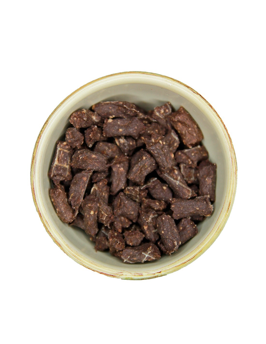 Snack natural para perros con un 98% de carne fresca de avestruz. Para su elaboración se seca la carne al aire de forma suave y natural y luego se refina en humo de madera de haya.