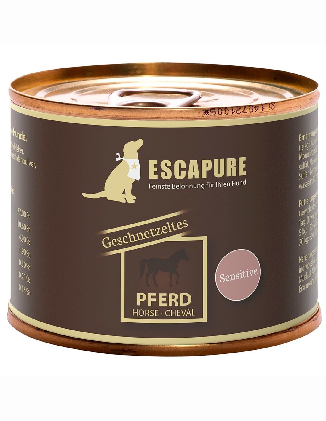 Se puede administrar como alimento completo y es adecuado para perros de todas las edades. Debido al cuidadoso procesamiento y la selección de ingredientes de alta calidad, la comida húmeda de Escapure es una dieta sabrosa y biológicamente apropiada para tu perro, digerible y sabrosa.