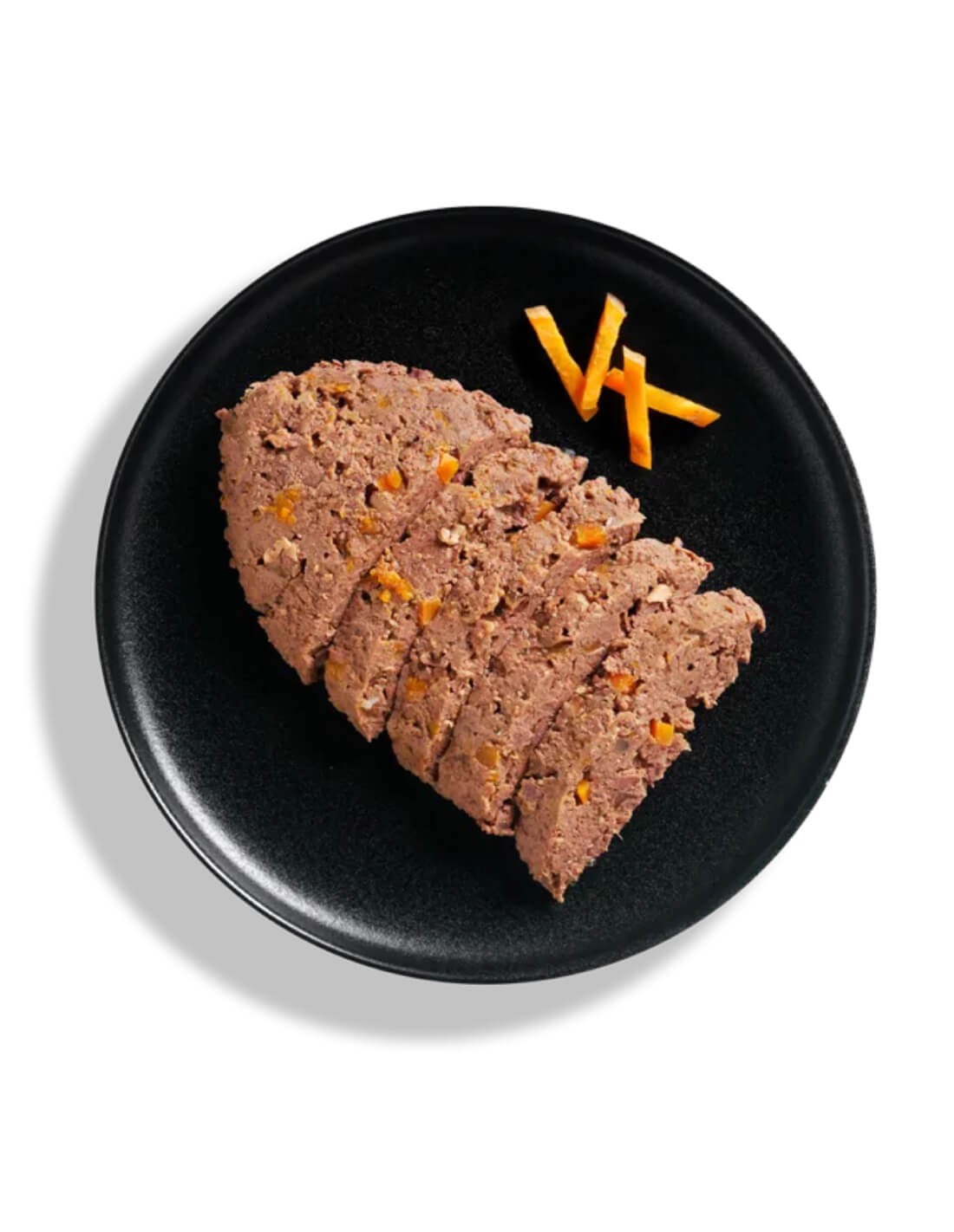 Corazón, pulmon y riñón de ternera (36,5%); carne, corazón, hígado de ave (30%); caldo de ternera, ave (28,3%); zanahorias (4 %); cáscaras de huevo, secas (0,5%); minerales (0,5%); aceite de salmón (0,2%)