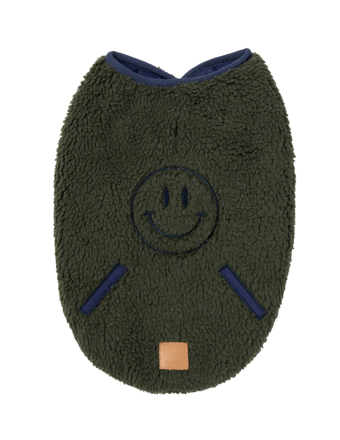 El lado 1 está confeccionado con un material sherpa grueso e incluye una carita sonriente bordada en un color en contraste. Los bolsillos falsos añaden estilo extra a esta prenda.