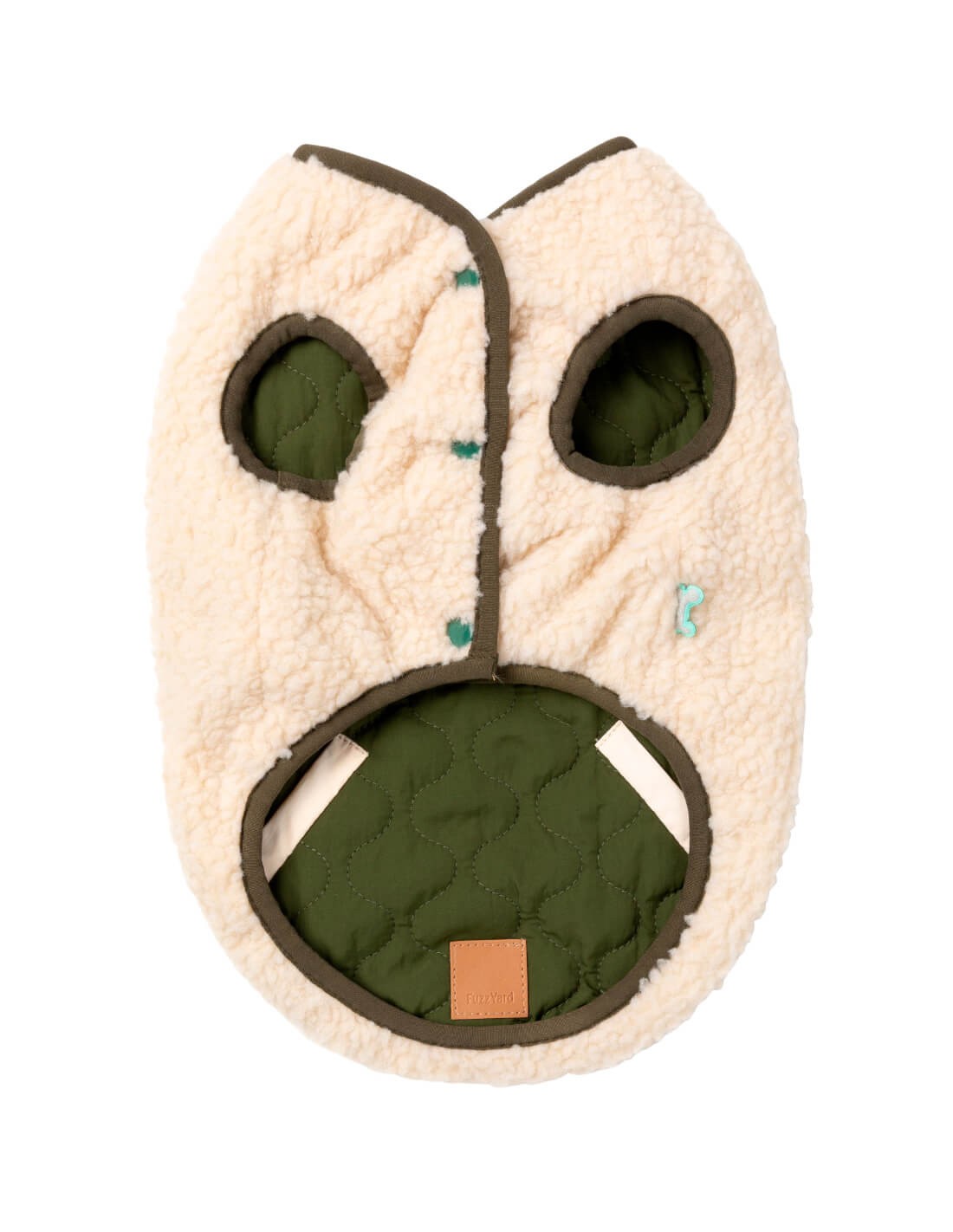 CARACTERÍSTICAS: - Diseño oficial de la Marca FuzzYard creado en Australia. - Diseño reversible: ¡tendrás dos conjuntos en uno! - Lado uno: material sherpa lujosamente grueso con cara sonriente bordada. - Lado dos: tejido acolchado de felpa. - Cierre de Botones a presión para facilitar su uso. - Incluye un orificio para el arnés. - Disponible en 2 colores y 7 tallas: Musgo Oscuro y Beige