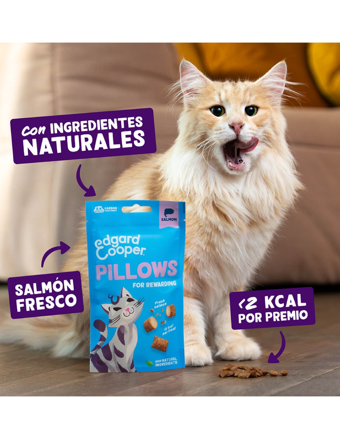 Con un exterior crujiente y un interior suave y cremoso, estos snacks ofrecen una textura única que volverá loco a tu mejor amigo felino. Elaborados con salmón fresco e ingredientes 100 % naturales, son una opción muy saludable, sin cereales ni azúcares añadidos. Además, con menos de 2 kcal por bocado, puedes mimarlo sin preocupaciones.