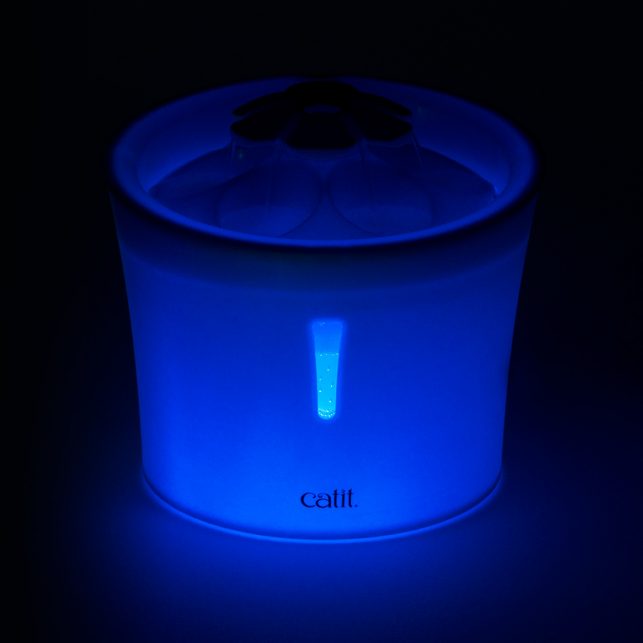 Fuente de agua para gatos con luz LED nocturna y tapa de pétalos con pequeños depósitos de agua que le permite a tu gato beber incluso cuando la fuente está apagada.
